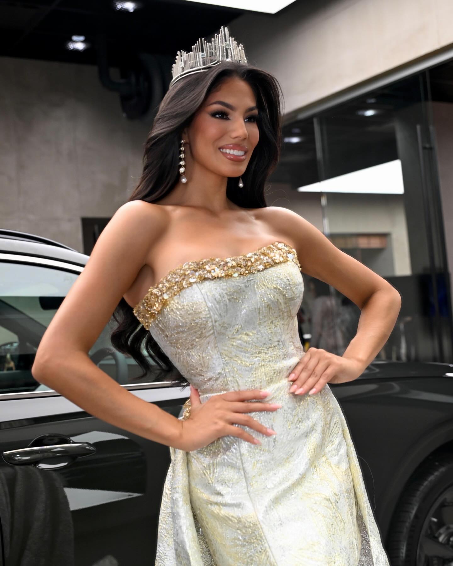 The look was completed with accessories by Charlie Lapson, reinforcing a refined and modern pageant aesthetic.